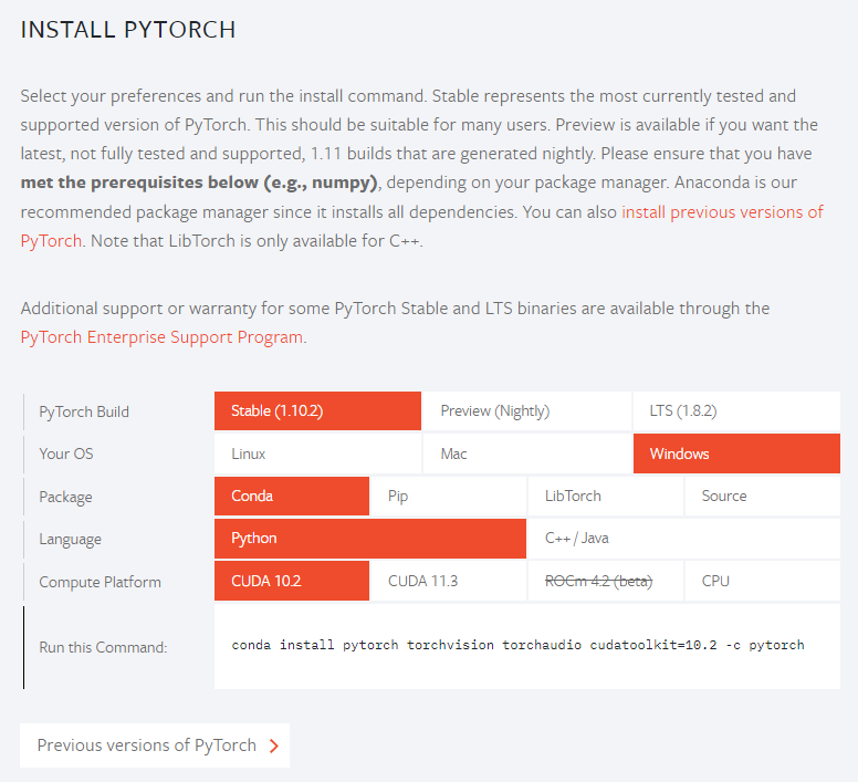 PyTorch Build : 현재 가장 안정 버전 / 최신 베타 버전 / 장기 지원 예전 버전 중 선택