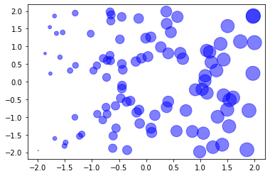 plt.scatter(x1, y1, color = 'blue', alpha = 0.5, s = (x1 + 2) * 100)