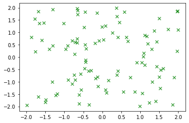 x와 y축 데이터 모두 -2 ~ 2 사이의 균일분포에서 추출한 데이터 x1, y1과