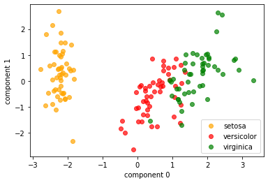 두 주성분이 꽃 종류별 feature들의 분포 특징을 제법 잘 잡아내고 있음을 볼 수 있었습니다.