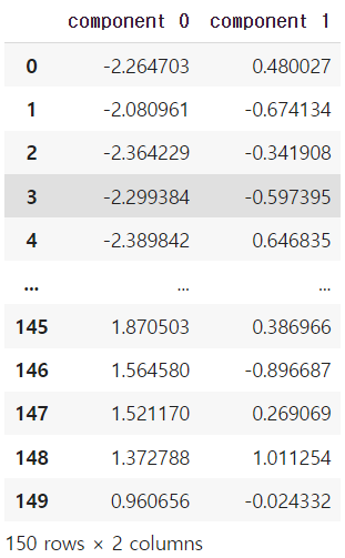 2차원으로 축소된 결과를 데이터프레임으로 나타내면 아래와 같이 표현됩니다.