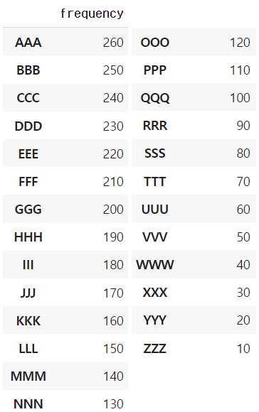 (편의상 두개의 열로 잘라서 표현되었지만, 실제로는 AAA ~ ZZZ의 26개 행이 1개의 열입니다.)