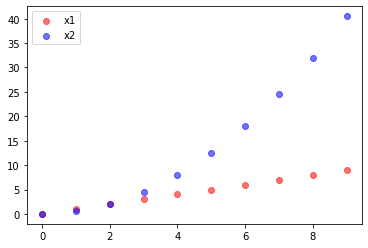 먼저, 아래와 같이 0~9 숫자의 x1 데이터와 0~9의 제곱수에 2를 나눈 x2 데이터가