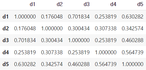 cos_sim_df = pd.DataFrame(cosine_similarity(tf_idf_df, tf_idf_df), columns = ['d1', 'd2', 'd3', 'd4', 'd5'], index = ['d1', 'd2', 'd3', 'd4', 'd5'])