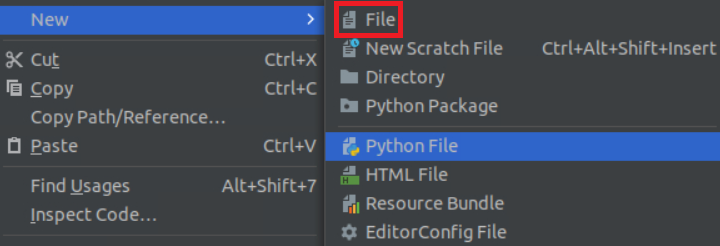 목록에서 빨간색으로 표시한 File 메뉴가 아닌 아래의 Python File 메뉴로 파일을 생성하셔야