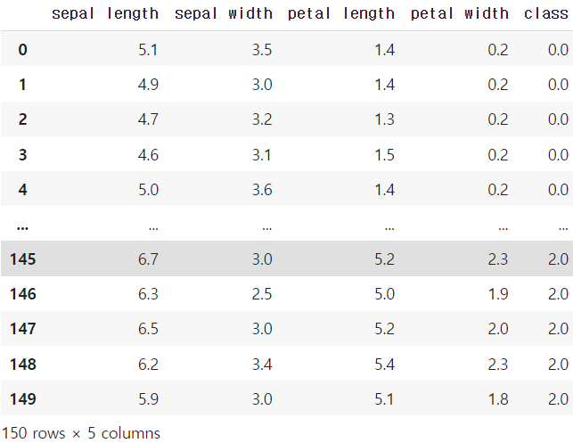 총 150개의 데이터가 각각 4가지의 feature와 class 정보를 가지고 있는 형태입니다.
