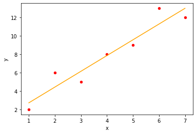 위에서 구한 식을 이용하여, 회귀선을 그래프 내에 같이 그려보도록 하겠습니다.