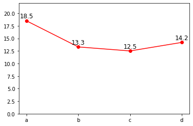 이번에는 plt.plot 함수를 사용했던 선 그래프에서 그래프 위에 숫자를 새긴 예시입니다.
