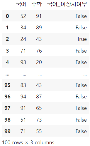 '국어' 열에 대하여 이상값 여부 판별 결과를 구하여 저장한 예시는 아래와 같습니다.