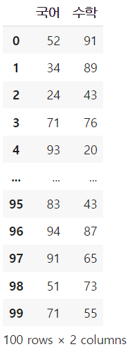 이해를 돕기 위하여 아래와 같이 100명의 학생들의 국어, 수학 점수 정보가