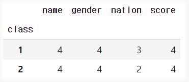 첫 번째로, 학급을 기준으로 각 column의 유효 element 개수(결측치 제외한 값의 개수)를 세어보도록 하겠습니다.
