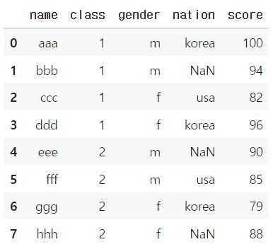 이름, 학급, 성별, 국적, 점수 5개의 column으로 이루어진 간단한 데이터프레임입니다.