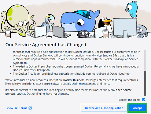 설치된 Docker를 실행한 뒤, 약관을 확인하시고 동의해주시면 됩니다.