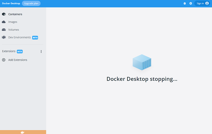 WSL2 미설치 시에는 아래와 같이 Docker Desktop stopping... 메시지가 등장하며,