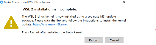 WSL2 미설치 시에는 다음과 같은 경고 창이 뜨게 되는데,