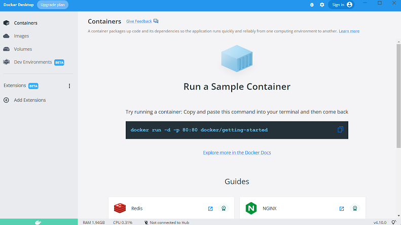 Docker Desktop starting... 메시지가 출력되며, 잠시 후에 아래와 같은 그림으로