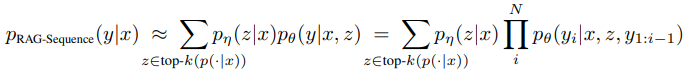 먼저, RAG-Sequence 방식의 경우에는 각 문단의 조건부 Sequence 전체 토큰 생성 확률 x