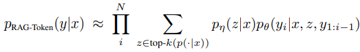반면에, RAG-Token 방식의 경우에는 전체 토큰 대신 각 토큰별 문단 탐색 확률 x