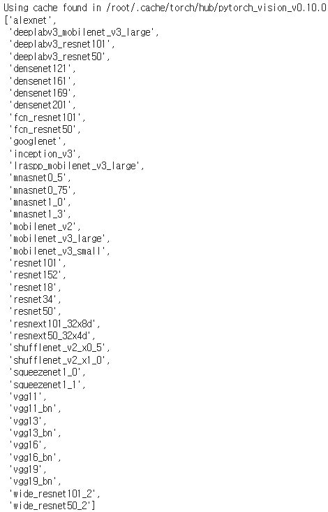 예를 들어, 0.10.0 버전의 pytorch/vision 리포지토리 내의 모델 목록을 출력하려면