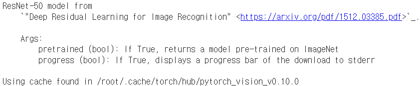 예를 들어, pytorch/vision 리포지토리 내에서 resnet50 모델의 설명을 출력하는 코드와