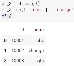 첫 코드에서 실행했던 데이터프레임 df를 재선언한 뒤, copy 함수로 복사를 진행 후, loc 함수로 값 1개를 변경해보도록 하겠습니다.