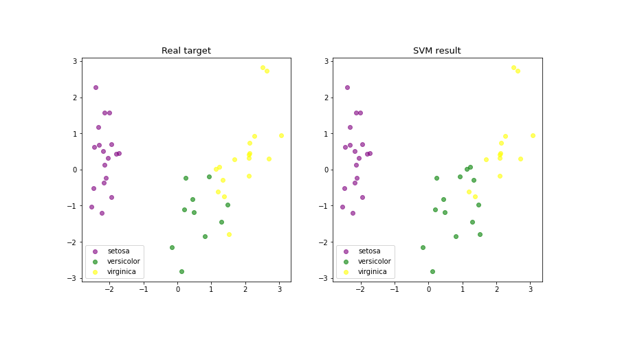 데이터 분포를 보아하니, 실제 라벨과도 제법 결과가 잘 들어맞는 것으로 보입니다. 물론 이 부분도 커널 함수 종류 등을 변경하면 양상이 달라질 수 있습니다. 여기까지 파이썬 사이킷런에서 SVM 기법을 데이터셋에 적용하는 방법에 대해서 간단히 다루어보았습니다.