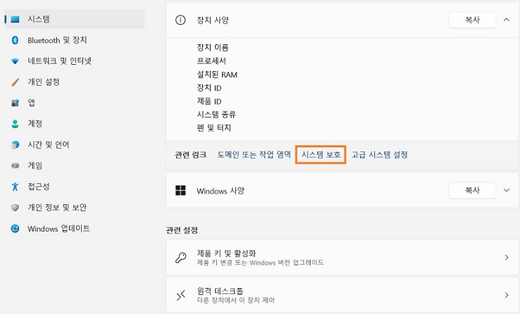 Windows 11 기준, 장치 사양 탭 내의 관련 링크에 있는 시스템 보호 링크로 들어갑니다.