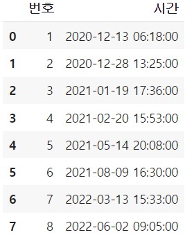 참고로, 먼저 아래 코드로 시간 정보가 있는 열을 datetime 자료형으로 변환해주어야 합니다.