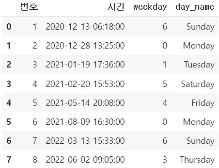 (참고 : 속성이 아니라 메소드라 dt.day_name이 아닌 dt.day_name()으로 사용해야 합니다.)