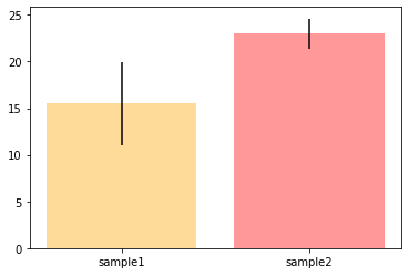 plt.bar(['sample1', 'sample2'], [mu1, mu2], color = ['orange', 'red'], yerr = [err1, err2], alpha = 0.4)