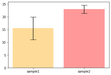 plt.bar(['sample1', 'sample2'], [mu1, mu2], color = ['orange', 'red'], yerr = [err1, err2], capsize = 10, alpha = 0.4)