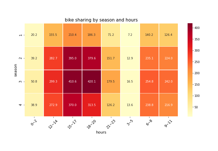여기서도 지난 글과 마찬가지로 캐글의 자전거 대여 수요 학습 데이터 셋을 사용하되, 이번에는 시간대와 계절 두 가지 범주를 가지고 그룹화를 진행하여 각 범주의 평균 자전거 대여 수를 대상으로 히트맵을 그려보도록 하겠습니다.
