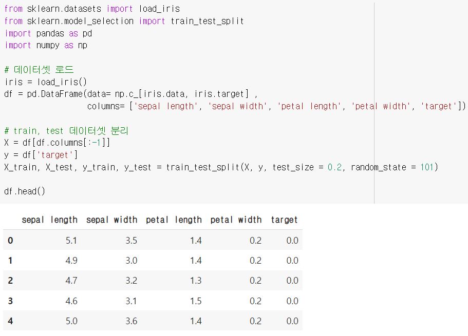 데이터셋은 sepal과 petal의 길이와 너비에 대한 4가지 feature와 붓꽃 종류를 나타내는 target column으로 구성되어 있습니다. 참고로, 여기서 target은 0, 1, 2 총 3가지 종류의 붓꽃을 의미합니다.
