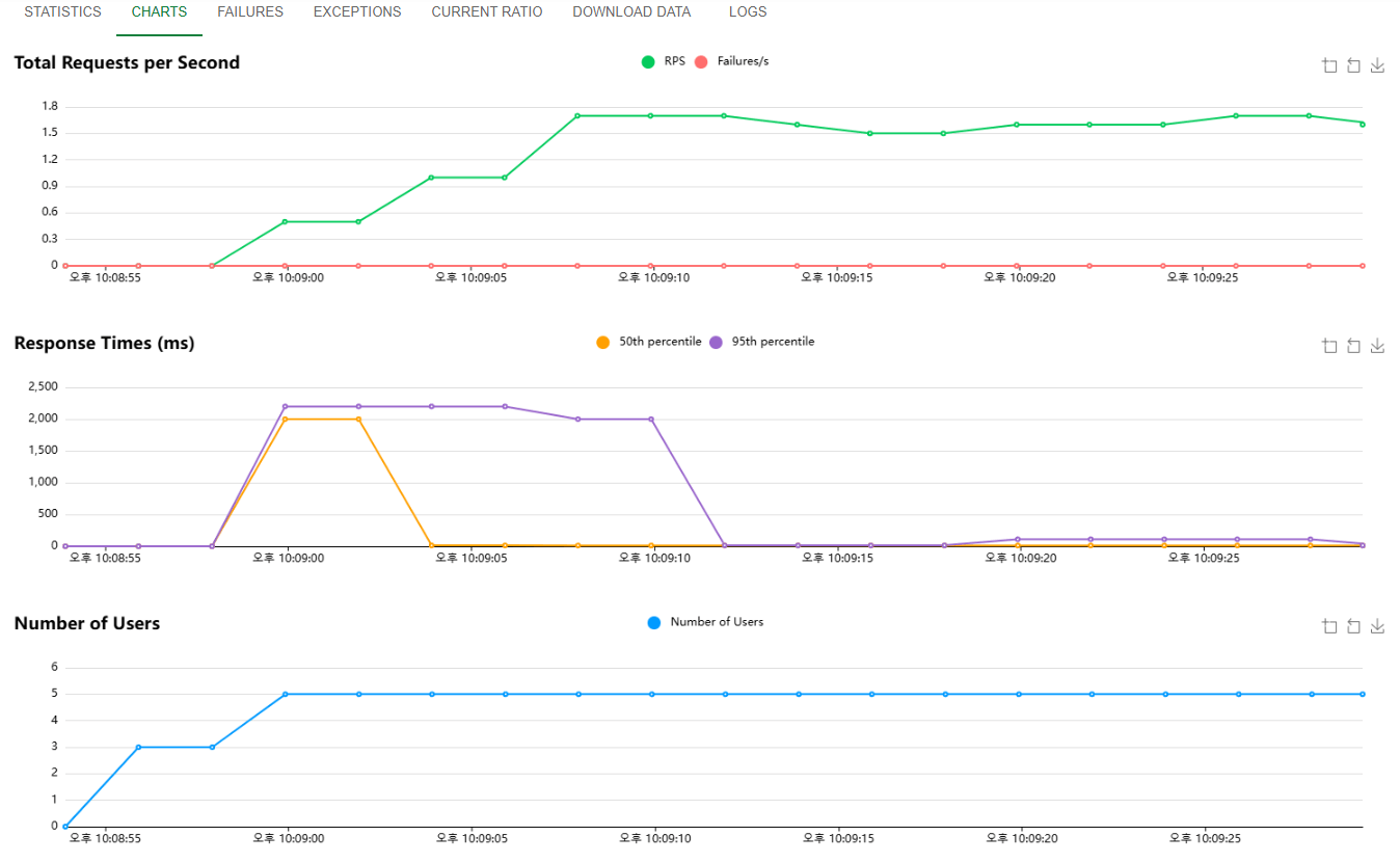 초당 5명씩 증가하여, 20초 이후 부터는 100명의 가상 유저로 부하 테스트가 진행됩니다.