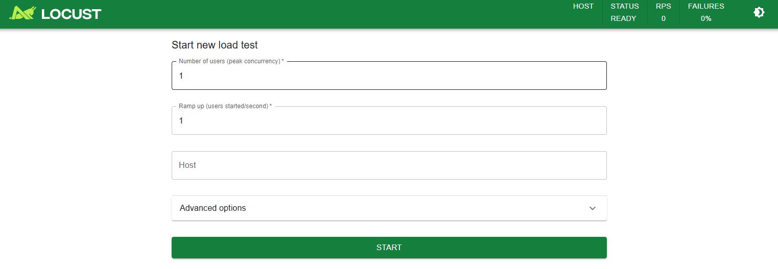그러면 http://localhost:8089 주소에서 Locust 웹 페이지 준비가 완료되고,