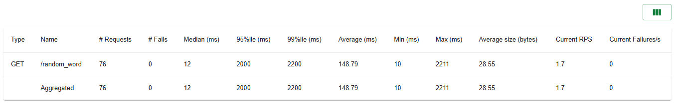 요청 및 실패 횟수, 요청 시간의 median, 95% 백분위수, 99% 백분위수 등의 정보를