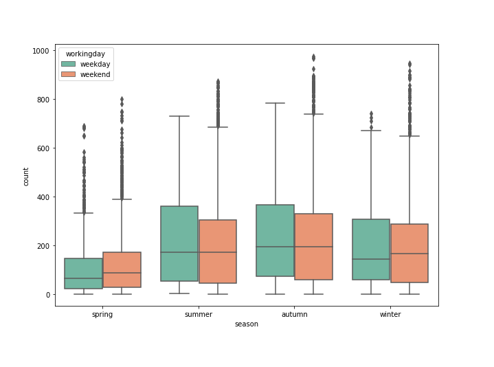 각 계절별 자전거 대여 수의 분포를 한 눈에 확인해볼 수 있었습니다.