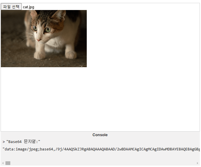 이 예제에서는 파일을 업로드하면 아래 쪽에 base64 인코딩 결과가 나타납니다.
