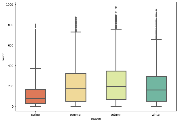 각 계절별 자전거 대여 수의 분포를 한 눈에 확인해볼 수 있었습니다.