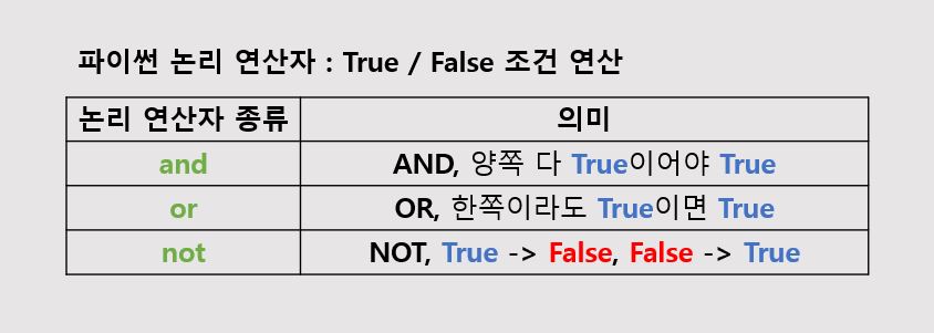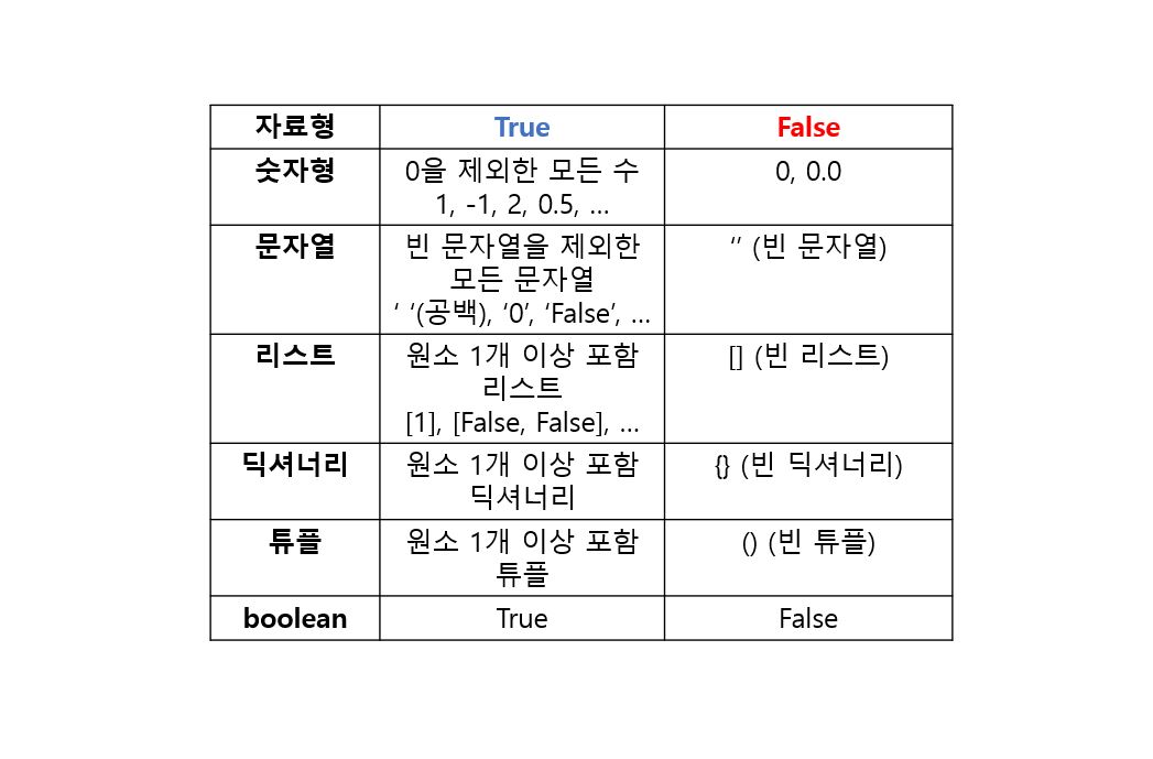 물론 파이썬에서 지원하는 boolean 자료형 True / False가 가장 기본적으로 사용되지만,