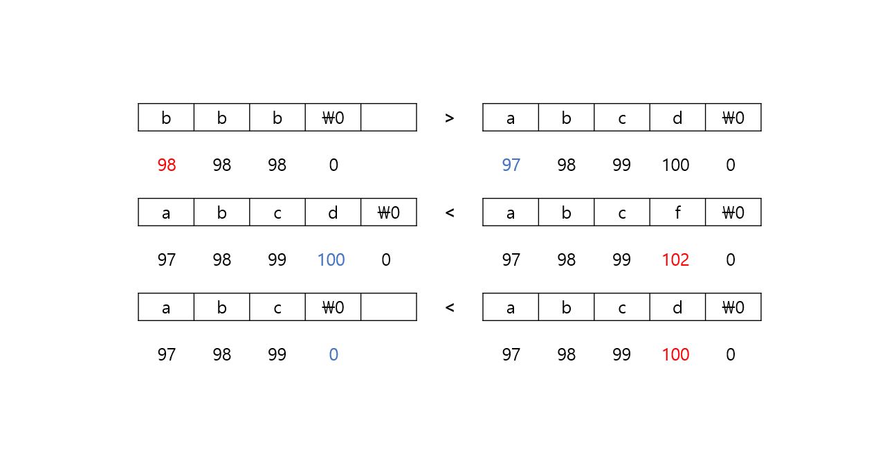 다른 글자가 나오면, ASCII 코드의 값이 더 큰 쪽이 큰 것으로 판정합니다.