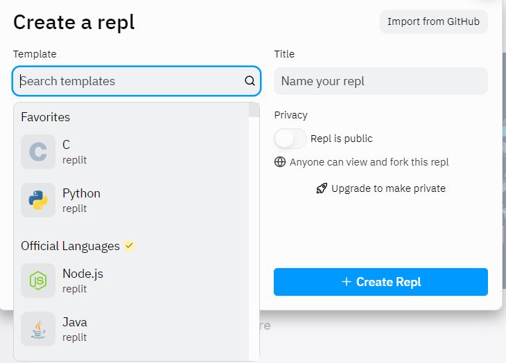 이제 언어를 선택하고 제목을 지정하는 창이 뜰 것입니다. 여기서 원하시는 언어를 선택해주시면 자동으로 환경이 생성되는데요, 저는 파이썬을 선택해보겠습니다. 이후 Title을 입력하는 칸에 원하시는 프로젝트의 제목을 입력해주시고, 프라이버시 여부(다른사람에게 공개를할지 여부)를 설정해주세요. 그리고 왼쪽 아래 파란색 Create Repl 버튼을 클릭해주시면 프로젝트 생성이 완료됩니다.