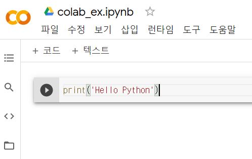 Hello Python이라는 문구를 입력하고 실행을 해보겠습니다. 실행은 Shift + F5 혹은 Ctrl + F5 키를 눌러주시면 실행이 되는 모습을 보실 수 있습니다. 첫 실행 시에는 구글에서 제공하는 컴퓨팅 자원과 연결을 해야하기에 런타임 연결 진행에 몇 초 정도 시간이 소요될 수 있습니다. 이후 코드 실행시에는 연결된 런타임에서 빠르게 실행이 됩니다.